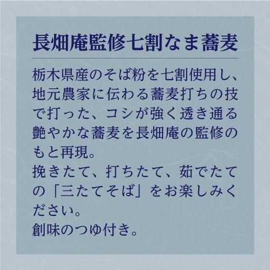 栃木県産のそば粉を七割使用し、地元農家に伝わる蕎麦打ちの技で打った、コシが強く透き通る艶やかな蕎麦を長畑庵の監修のもと再現。挽きたて、打ちたて、茹でたての「三たてそば」をお楽しみください。