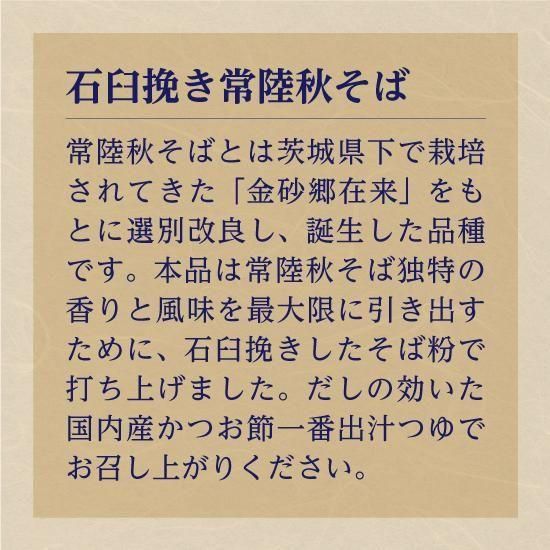 常陸秋そばとは茨城県下で栽培されてきた「金砂郷在来」をもとに選別改良し、誕生した品種です。本品は常陸秋そば独特の香りと風味を最大限に引き出すために、石臼挽きしたそば粉で打ち上げました。