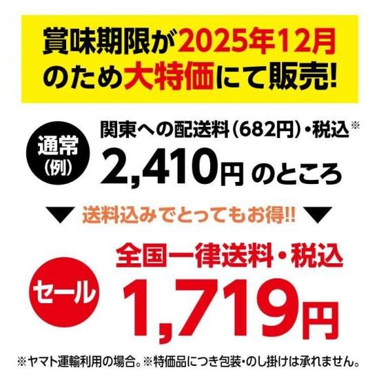 賞味期限が2025年12月までのため、送料込みの特別セール価格での販売となります。