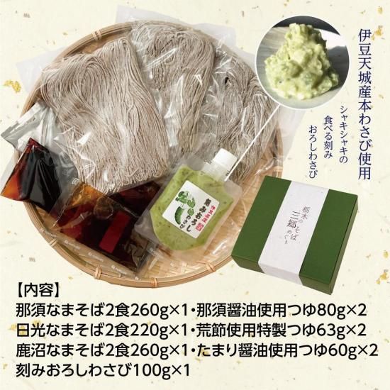 1146g(日光産そば粉使用なまそば めん220g×1、鹿沼産そば粉使用なまそば/那須産そば粉使用なまそば めん260g×2、添付つゆ63g×2、60g×2、80g×2、刻みおろしわさび100g×1)