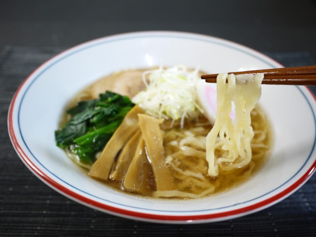 青竹打ち風の平打ちちぢれ麺が特徴の独特の食感の太麺に、さっぱりとしてコクのある澄んだ色合いが特徴のあっさり醤油スープを合わせた自慢の一品です。